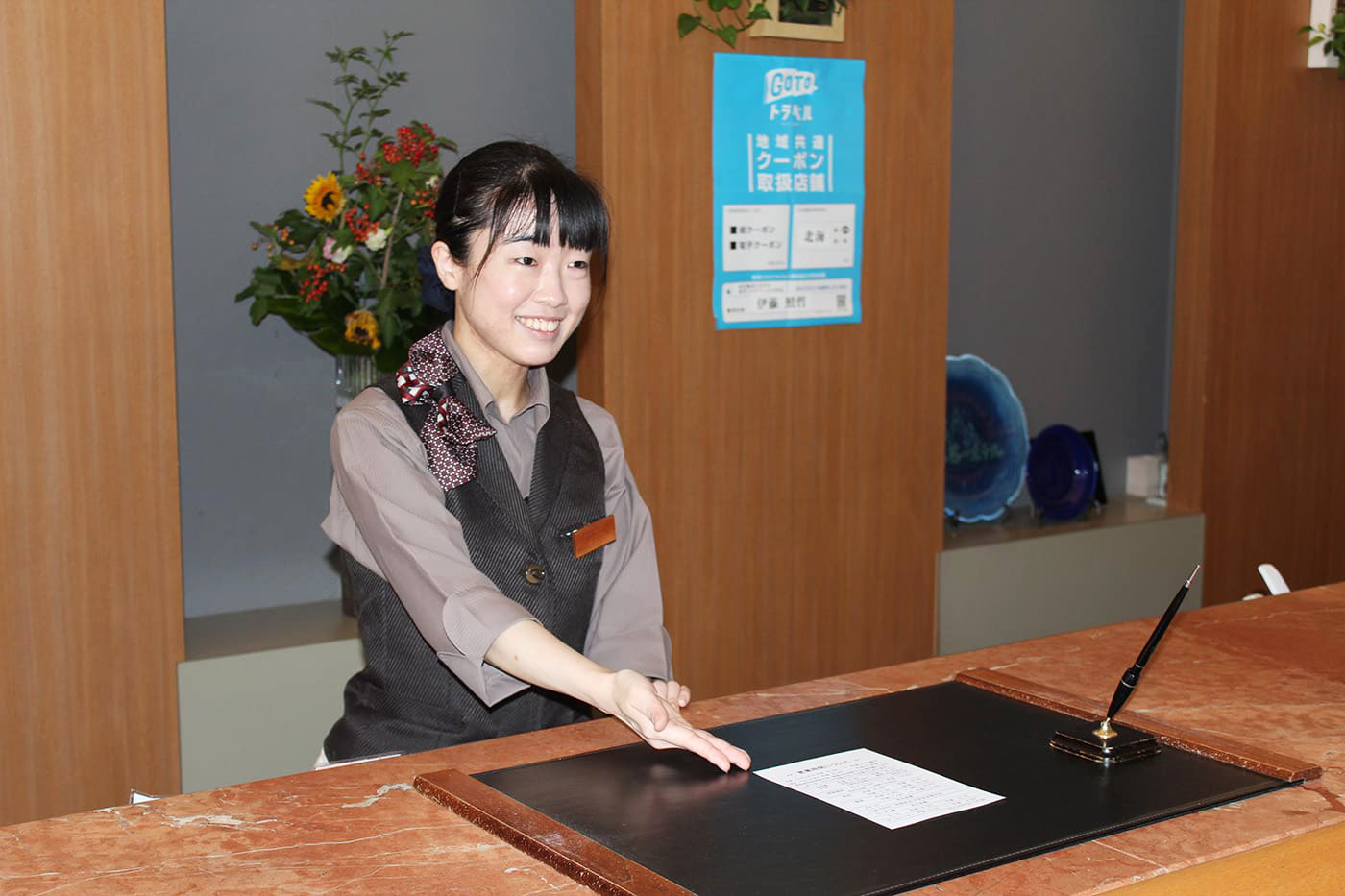 お出迎え・お見送り、チェックイン・チェックアウト精算、客室案内、手配対応、布団敷き・上げなどの業務を行います。